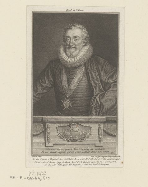 Curator: Before us is a striking engraving by Albert Haelwegh, dating from between 1665 and 1672. It's a portrait of Hans Svane. Editor: It’s somber. The density of lines creating a play of light and shadow—almost gothic. Curator: Precisely. Haelwegh uses the graphic possibilities of the medium to define form, to create tone, and ultimately, meaning. The density of line around the face and robe create depth and dimensionality, especially where the ruff frames Svane's features, creating an incredible textural contrast between skin, lace, and heavy fabric. Editor: But at whose expense? We should consider who Hans Svane was. A professor of theology during a period of religious and political turmoil, this image becomes a powerful symbol of establishment power. The detailed rendering could be interpreted not as admiration, but as a pointed statement on the rigidity of the church and its place in society. Curator: I disagree that there’s criticism necessarily embedded in the level of detail. Rather, I see a careful rendering of surface and form. Observe how Haelwegh uses the linear structure inherent in the engraving process to create a portrait with subtle modeling. It draws the eye to specific elements. Consider the arrangement of the text below, which functions as both inscription and formal element. Editor: True, the text adds to the overall composition. Yet it's inseparable from its content, isn't it? It anchors him further into a very specific history of class and privilege during a time that saw rampant social inequalities, cementing his role, visibly. Curator: Ultimately, that's where the value lies, I suppose – the artwork’s unique synthesis of formal precision with a complex portrayal that history keeps shaping and reshaping. Editor: Indeed, and seeing it allows us to grapple with enduring questions of power, representation, and the role of individuals within systemic structures, even centuries later.