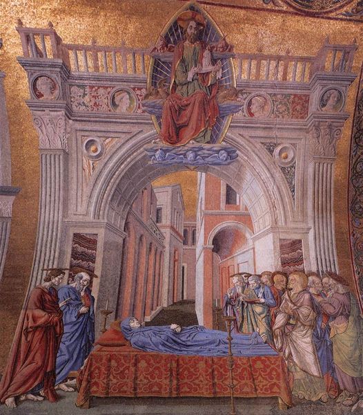 Curator: So much stillness and yet, it feels utterly vibrant, doesn't it? Editor: Yes, it does. It’s as if Benozzo Gozzoli, around 1452, paused time within this fresco—entitled “Establishment of the Manger at Greccio”—allowing us to eavesdrop on a pivotal moment of faith. It’s Renaissance art embracing a kind of narrative transparency. Curator: Right! There's almost a theatrical quality. The careful architecture in the background reminds us that even spiritual moments are witnessed, staged, performed for a community—then and now. And look how he plays with perspective to invite you into this almost intimate scene. Editor: And how odd! An indoor nativity with real barnyard animals inside a Gothic basilica... Very bizarre if you think about it too much. But it makes you reflect, perhaps, that something divine, like the incarnation, could just spring out anywhere! Curator: Precisely. It speaks to the democratizing impulse of the Franciscan order that this work illustrates, really. Greccio was a small town and Saint Francis staged the Nativity to allow even the most unlettered person access to a divine story. So even the animals play a central role in creating this accessibility. Editor: You know, beyond the socio-religious impact of works like these, what really grabs me is the expression on the Saint’s face while he holds the Christ Child—as if Gozzoli caught the purest reflection of love imaginable. Like a fleeting spark in the infinite night. Curator: Yes, an almost dreamlike sense pervades, yet it is grounded by that intense gaze. This balance between ethereal and earthy reminds us of art’s enduring power to make complex spiritual narratives felt on a human scale. Editor: Yes, this really resonates, like how an ancient story gets etched on our mind not by its dogma, but through the vivid colors of our own imagination. Curator: Well put. Gozzoli managed to create something timeless and deeply moving, even centuries later. Editor: It definitely reminds us that masterpieces don’t only need technical excellence but a whole lot of genuine passion that can survive over time.