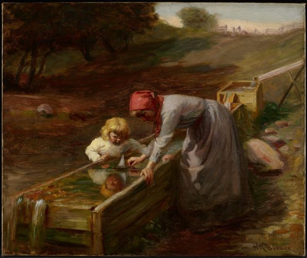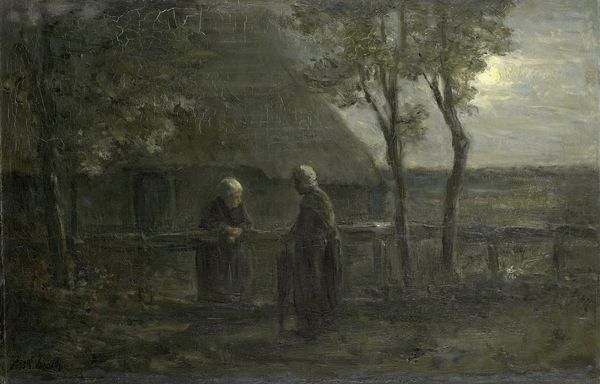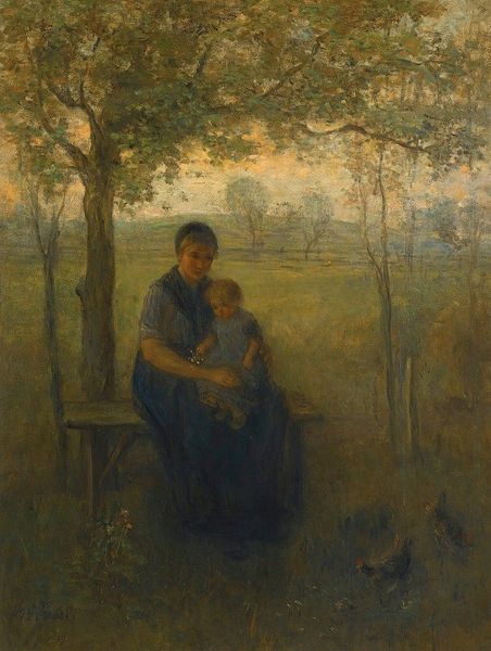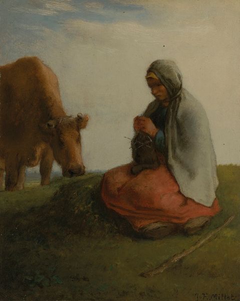 Curator: Camille Corot’s "Les Deux Sœurs Dans La Prairie," or "Two Sisters in the Meadow," presents us with an intimate, yet hazy scene of figures in a landscape, rendered in oil paint. It evokes a certain melancholic stillness. What are your first thoughts? Editor: I’m immediately drawn to the tenderness in this pastoral scene. The embracing figures radiate a feeling of protection, like a mother shielding her daughter, or perhaps elder sister. This feeling, for me, overrides anything else in the scene. Curator: It’s interesting you pick up on that tenderness. I find the painting somewhat ambiguous in its socio-political context. Genre painting became more popular, representing everyday life. But it raises the question: who are these figures, really? The "sisters" motif becomes popular in 19th-century art, but what does sisterhood really signify here? What ideological message about women and social classes is this painting delivering to the audience? Editor: Ideology, always present, of course! I would say the imagery—the protective embrace, the quiet field with grazing cows— evokes themes of comfort and rural stability, ideals which were valued increasingly as the Industrial Revolution progressed. It's more dreamlike than realistic. The older figure has a clear maternal symbolism to me with her enveloping protective gesture. Curator: Maternal symbolism is a solid reading, considering the prevailing societal expectations of women. The Realist label makes sense when you consider Corot was engaging with portraying the daily lives of common people. What do you make of the style, in light of Corot’s broader oeuvre? Editor: Well, in comparison to other landscape paintings that showcase Corot's delicate light and atmospheric effects, here, the hazy figures almost emerge from the landscape as symbols themselves. Look how their neutral color palette integrates with the verdant background, they are one with their surroundings. I am very taken by this effect! Curator: The fact that it is a plein-air piece definitely brings Corot closer to the later Impressionists; the figures could certainly be swallowed up by the elements. But seeing how intimism also factors in as a core theme reminds us of its socio-cultural purpose: creating accessible genre painting reflecting everyday experiences. The hazy details were a reflection of what, exactly, within that everyday life? Editor: A return to the familial sphere maybe, with a symbolic invitation into an Arcadian ideal? Corot creates a haven from encroaching industrial society. Curator: Ultimately, a seemingly simple image contains many layers of socio-historical complexities that inform its meaning. Editor: Yes, symbols that connect on many levels. It's far more moving when you start digging!
