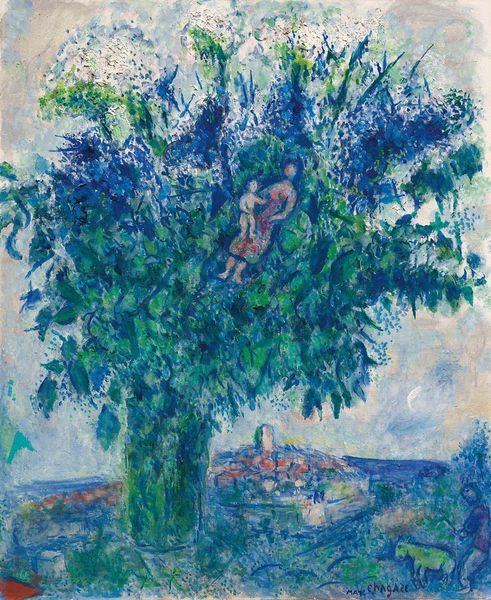 Editor: So this is "Les fiancés aux anémones," or "The Betrothed with Anemones" by Marc Chagall, from 1979. It’s an oil painting, and immediately the swirling blues and greens create this dreamy, almost otherworldly feel. The materiality seems key to understanding its ethereal, romantic nature. What’s your take on it? Curator: Focusing on the material application, observe how the oil paint isn't just conveying form, but actively constructs the image. Notice the layering, the visible brushstrokes—these techniques don’t merely represent a landscape; they actively produce an emotional space. What socio-economic factors might have been influencing Chagall's use of these specific techniques and materials? Editor: Well, knowing that Chagall often drew on his Jewish-Belarusian heritage and experienced displacement, perhaps the dreamlike quality and vibrant colors are a form of escapism or a celebration of the joys found even in difficult circumstances? Is the materiality then a deliberate choice to elevate lived experience? Curator: Exactly. Consider the availability of materials at the time, too. Post-war, the accessibility of oil paints was different. The gestures embedded in these brushstrokes also reference a longer tradition of the artist's hand being a signifier of value, a value tied to consumption and the art market itself. Is the ethereal quality almost obscuring the social realities beneath it? Editor: I hadn’t thought about the constraints and possibilities inherent in the materials themselves, or the artist's "hand" being a signifier of value. It certainly prompts you to consider the artmaking process more broadly, not just the finished artwork! Curator: And to consider the ways materials are used both to obscure and to reveal aspects of human labor, class, and other social conditions, as they're being shaped and re-shaped.