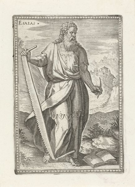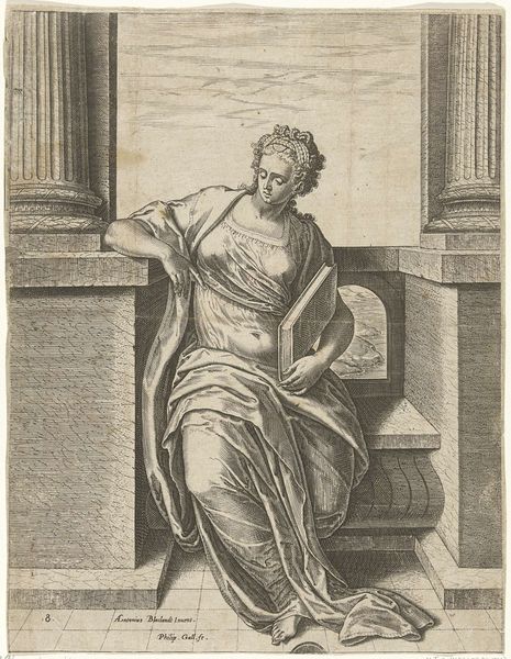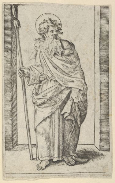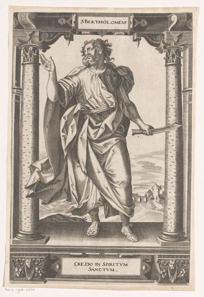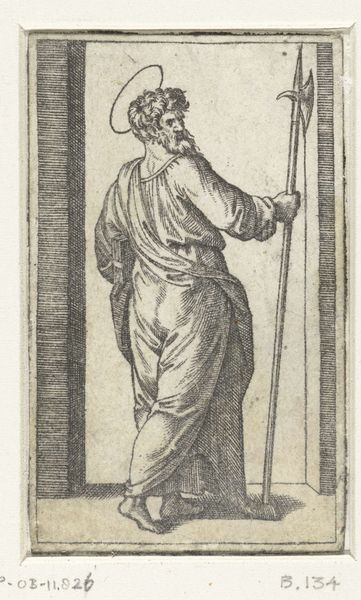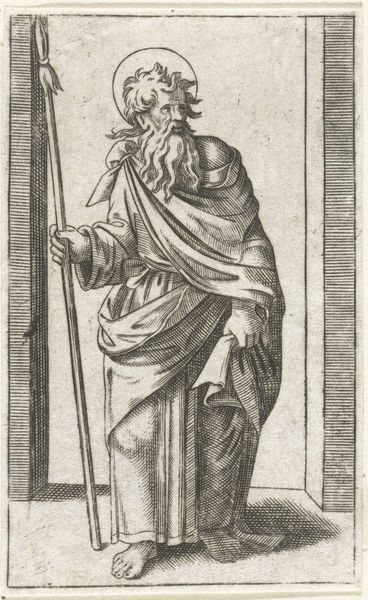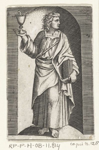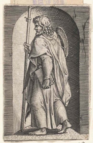 Editor: Here we have an engraving, “Apostel Matteüs met beurs staand in nis,” depicting the Apostle Matthew with his purse, standing in a niche. It's from sometime between 1517 and 1577, by an anonymous artist. It gives off a very serious, almost austere, feeling. What strikes you when you look at this work? Curator: The austerity grabs me too! But beneath that, I sense a deep empathy. Look at how delicately the lines render the folds of his robe, almost lovingly, wouldn’t you say? There’s also something almost haunting in the figure's expression, wouldn’t you agree? Do you see it? The etching style reminds me a bit of peering through a historical looking glass. Editor: Yes, there's definitely a somberness. The level of detail achieved through the lines is amazing, though. It's interesting how such simple means can create such depth of emotion. I also notice the purse—it’s quite prominent. Curator: Ah, the purse! The quintessential attribute of Matthew, the former tax collector. It's a clever way of showing Matthew as the tax collector becoming St. Matthew. That pose suggests almost that Matthew might be checking on his riches for the last time... Is it me, or is there something of the actor about Matthew here? Editor: It could be read that way. Thanks. Thinking about it now, it is interesting how the artist tells the entire story about Matthew using only one image. It is not just a portrait, but more like a history painting, and this is maybe why it's not just austere, it's serious. Curator: Precisely! You are on to something profound. The piece whispers volumes about transformation, about leaving one life for another, perhaps finding redemption in the simplest of engravings. So glad you came here today, it really allowed me to share some unique thoughts that have been bottled inside me. Editor: This really has helped me to think of art as being something deeper and less superficial than I assumed at first!