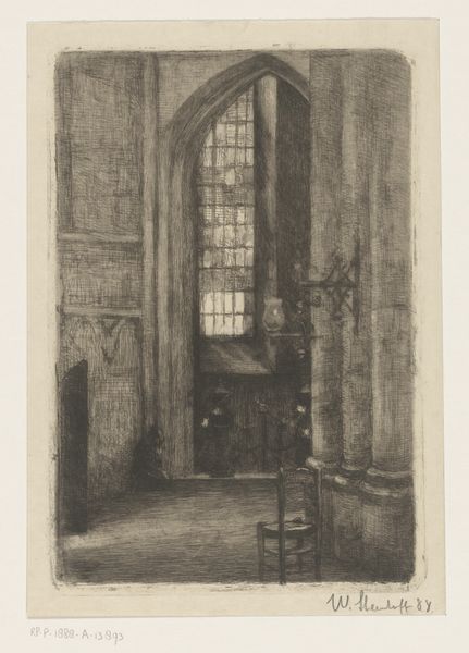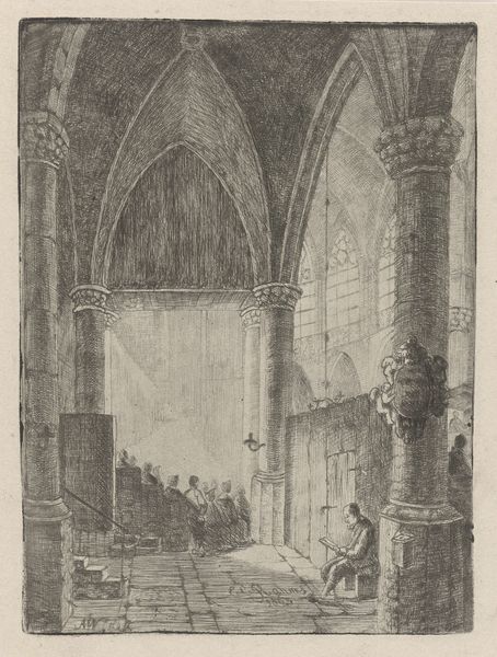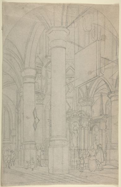 Editor: This is Adrianus Wilhelmus Nieuwenhuyzen’s "Kerkinterieur met een jongen en een zittende vrouw," created in 1856, using pen, ink and pencil. The intricate details and use of perspective create this incredible sense of vastness and stillness in what seems to be a Romanesque church interior. What kind of dialogue do you think Nieuwenhuyzen is trying to create between the architecture and the figures? Curator: Considering its socio-historical context, this work offers a commentary on the role of religion in mid-19th century Dutch society. The vast interior dwarfs the figures, underscoring a sense of individual insignificance before institutional power. The church itself becomes a character, almost. Look at how the lines emphasize height and the play of light and shadow. Do you think the artist intended a critique or simply a reflection of the period? Editor: It does feel like there's a sense of critique. The starkness of the lines, the limited detail given to the human figures - almost like they're afterthoughts. It’s less a celebration and more a study of how social spaces can define individual experiences, right? Curator: Precisely! And we can't ignore how images of church interiors served a public function in visualizing faith during a period grappling with modernity and secularization. The 'genre-painting' aspect blends into that as well, placing the everyday within the context of something greater. So, how might the contemporary viewer's reception differ from that of the 1850s? Editor: Well, maybe now we focus more on the artistic skill itself, the perspective and the composition. We are probably less invested in the religious implications. Curator: Yes. I think reflecting on its historical placement certainly enriches the viewing experience. Editor: Definitely! I appreciate gaining a new way to appreciate the dialogue between its form and context.