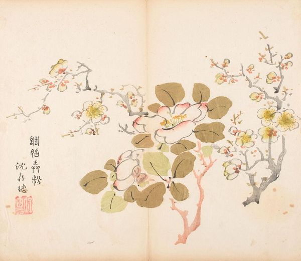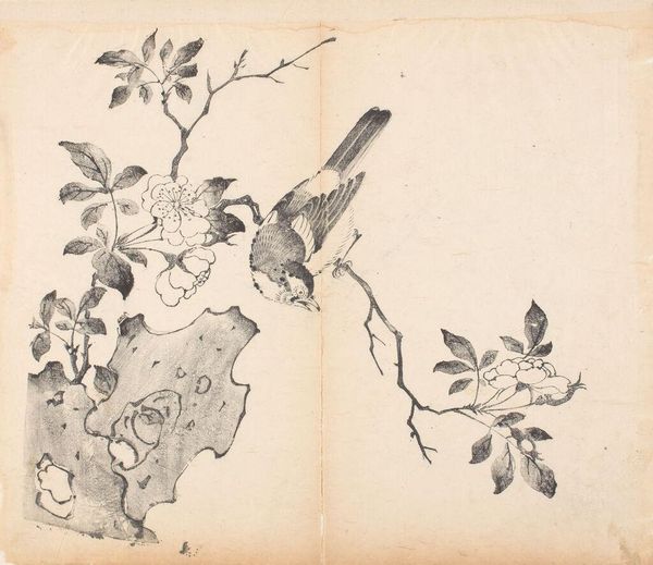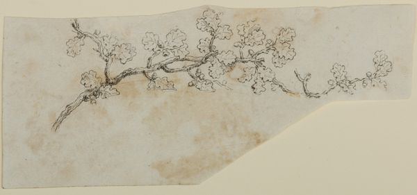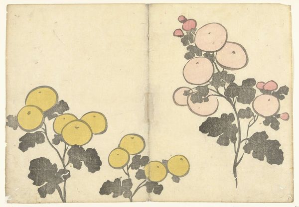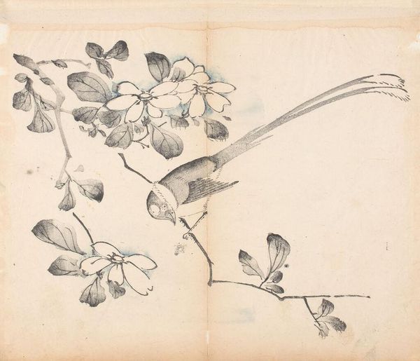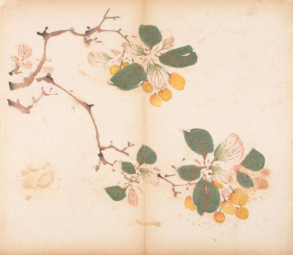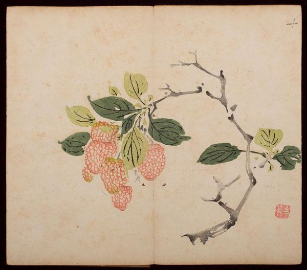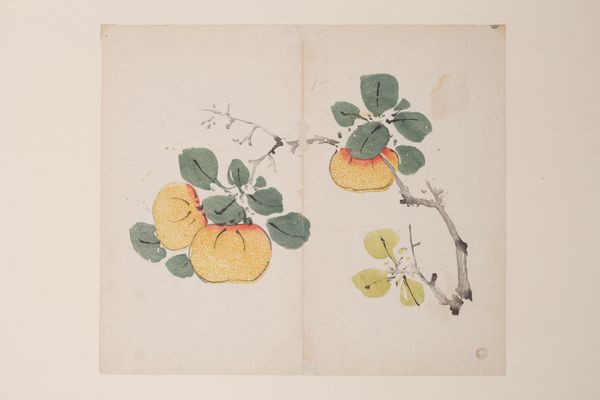 Curator: Here we have a page from a sketchbook by Matsumoto Kōzan, created around 1864. The artwork offers a glimpse into the natural world, showcasing organic elements. Editor: It's deceptively simple, isn't it? I'm drawn to the spare quality of the watercolor, how the thin washes of ink define the shapes of the fruit and leaves without feeling heavy or overworked. You can almost feel the paper. Curator: Precisely. This work aligns with the Ukiyo-e tradition, reflecting a common theme of finding beauty in the everyday, and a larger tradition of sketchbooks in Japanese painting. It gives you the feeling of observing something private, something casual yet refined. It's an interesting document within a certain sector of society at the time. Editor: When looking at this, I also think about what informed Kōzan's selection of materials, or perhaps the restrictions he faced at the time. Consider what type of ink was available to him or what he was expected to have as his color palette? Also, who commissioned these artworks? These choices certainly shaped what this sketchbook could and would eventually become. Curator: That's an insightful perspective. There's often a perceived hierarchy between a "finished" painting meant for display and sketches meant as studies. But these sketchbook pages have such charm, almost because of their intimate scale and casual nature. You can feel his process here. Editor: Agreed. And what’s striking is that Kōzan achieved an extraordinary refinement within such modest means. These kinds of practices also elevate what might be viewed as the realm of the everyday – papermaking, ink production – to a central role in the artwork. Curator: Overall, Kōzan’s sketchbook page invites a closer look, showing how everyday subjects, approached with sensitivity and skill, provide us with a window onto Japanese society and aesthetics during the 19th century. Editor: Absolutely, by focusing on these types of mediums and means of production, this becomes less about some ethereal notion of Japanese aesthetics and more about something grounded, and real.