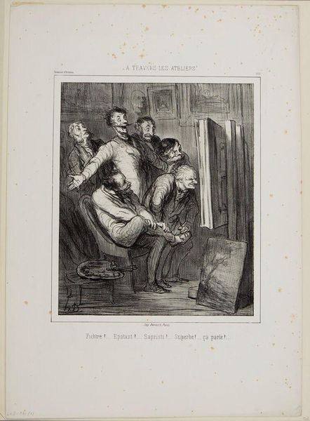 Editor: This is "Avarice" by Honoré Daumier. I'm struck by how the figures are arranged, almost like a stage play, with the central figure highlighted by the converging lines. What compositional elements stand out to you? Curator: The dramatic chiaroscuro creates a strong sense of depth and tension. Note how the artist contrasts the angular lines of the architecture with the curved forms of the figures, heightening the emotional intensity. How does this tension inform your interpretation? Editor: I think it emphasizes the man's isolation and vulnerability despite his wealth. I hadn't noticed the angularity before, it makes it feel more confined. Curator: Indeed. Daumier masterfully manipulates form and tone to convey a powerful narrative of greed and its consequences. It’s a study in visual rhetoric. Editor: I'll definitely pay closer attention to those details in future analyses. Thank you for pointing that out.