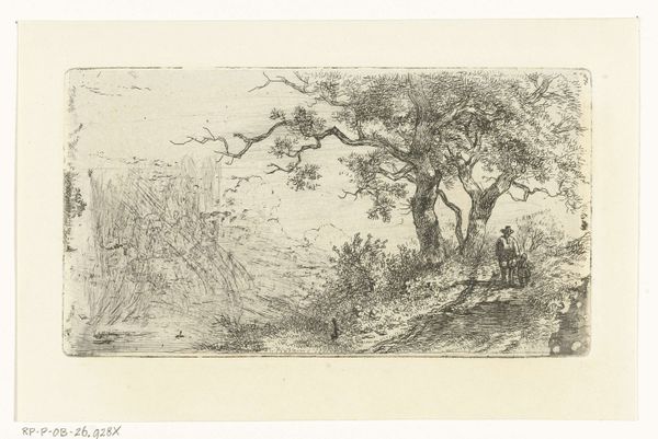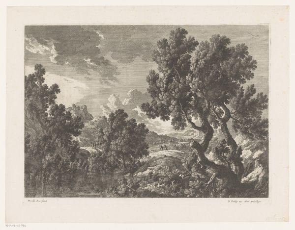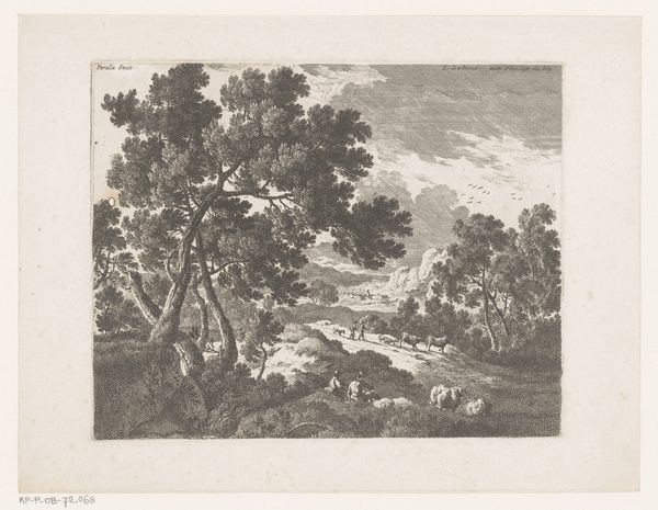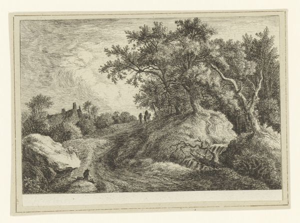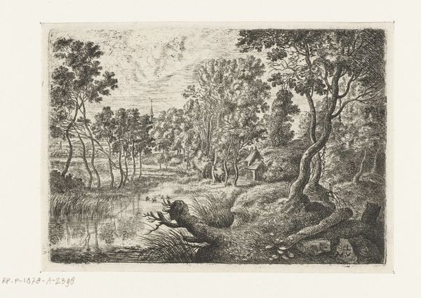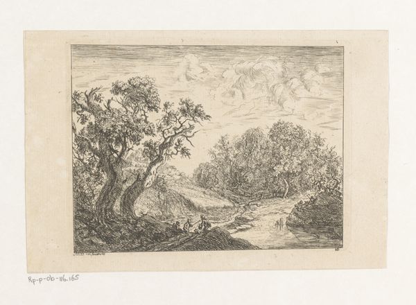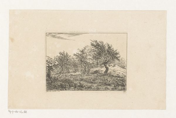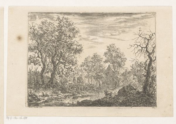 Christian Ludwig von Hagedorn created this landscape with a farm by a ditch in the 18th century. The etching’s composition leads our eye through a meticulously crafted scene. Look at how Hagedorn uses line and texture to create depth. The foreground is densely packed with detail, achieved through close hatching, while the background is rendered with lighter strokes, suggesting distance and atmosphere. The deliberate arrangement of trees, the winding ditch, and the placement of the farmhouse all contribute to a structured, almost stage-like space. This structured approach can be seen through the lens of Enlightenment ideals, reflecting the era’s interest in order and rational understanding of the natural world. The etching employs semiotic codes typical of landscape art at the time, with each element—trees, water, buildings—functioning as signs within a visual language. This is not just a picture of nature; it is a constructed vision of nature, carefully composed to convey a sense of harmony and order. Notice, for example, how the artist uses the subtle variations in line and tone to challenge a purely idyllic reading, suggesting an undercurrent of complexity. The enduring appeal of this work lies in its balanced play between formal structure and suggestive details.