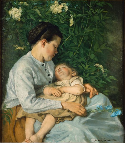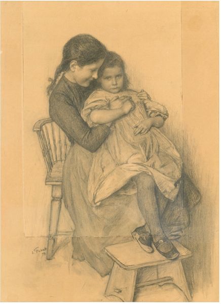 Curator: Here we see Émile Friant’s 1898 oil painting, “The Child’s Sorrow.” It's quite evocative. Editor: Indeed. The painting is quite affecting. The contrast between the two girls is immediate; one seemingly offering comfort, while the other looks quite distraught. Curator: Let’s explore that dynamic. Considering the era, it’s fascinating to consider how societal expectations influenced Friant's depiction of girlhood. How does the painting, through the lens of gender and power dynamics, portray female emotional experience? Is this intimism or simply another variant of the patriarchal gaze? Editor: I see it rooted more firmly in its material context. Notice how the soft, almost worn textures of their clothes suggest a life lived with practical realities, a directness contrasting the sentimental idealization so prevalent at the time. How does the artist's deliberate choice of muted tones influence our perception of class and labour here? Curator: That is a good point, and one that sheds some light on Friant's stylistic approach to Realism with elements of Symbolism; not just raw representation but heightened meaning through form. Looking at other pieces by Friant like "October," you could easily say that he tries to communicate his vision of his epoch by taking his observation directly from it. I wonder how his politics played into the subjects of his work? Editor: Definitely, that connection to "October" makes it hard to divorce the imagery from the physical conditions of life. We need to look closely at the construction, brushstrokes, and application of oil. The fact that we see that stool tells me the figures are of the labor class, yet they appear posed in order to represent something other than what their means portray them as. This piece really is one that is deeply tied into both historical events, the people in them, and those figures places within it. Curator: So while he may not have explicitly been calling for equality in every sense of the term, what could he have been saying with these figures' gaze in "The Child’s Sorrow?” Perhaps through the juxtaposition, Friant urges us to contemplate the universal nature of childhood suffering within vastly different socio-economic frameworks? Editor: Well, seeing as this piece, at its most basic, explores youth in all of its sorrowful beauty and melancholic realities, and because Friant was invested in recording daily contemporary life, one can only imagine the thoughts he may have pondered at the time he was working on this portrait. A true product of its time! Curator: It certainly seems that you are right about the fact that the materials of their class speak just as loudly as the composition of this tender painting.
