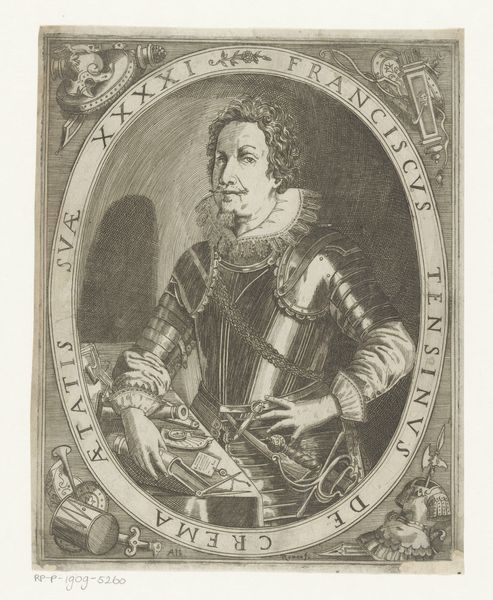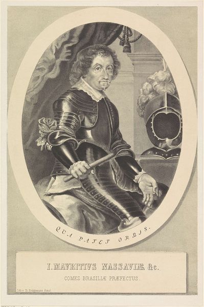 Curator: Here we have Theodor Matham's engraving of Johan Maurits, Count of Nassau-Siegen, created sometime between 1621 and 1676. Editor: My initial reaction is drawn to the contrasts, the cool, almost metallic sheen of the armor against the softer, warmer tones of his face and hair. Curator: Absolutely. Matham uses engraving to meticulously render texture. It's part of the Dutch Golden Age portrait tradition, of course, but considering Johan Maurits' role as governor of Dutch Brazil, how does it complicate or support ideas of Dutch power at that time? How does his position impact global dialogues about identity and empire? Editor: While it does portray wealth and military power through those carefully etched details, what truly strikes me is the circular frame itself. Its bold lettering and deliberate placement seem to simultaneously confine and amplify the subject's presence. It’s almost an emblem of contained power, if you will. Curator: The text itself emphasizes his governance extending to "where the world lies open," right? But also, how can we ignore the uncomfortable juxtaposition? This is a celebration of a figure complicit in colonialism and slavery, carefully positioned within a burgeoning artistic market supported by wealth gained through exploitation. It is history inextricably tied to human suffering. Editor: But the cool detachment of the engraving process… the crisp lines, the controlled shading… all this elevates it, transmuting something grounded into the realm of ideal, permanent forms. Curator: Precisely, and that tension is at the heart of it. How do we reckon with the artistic achievement and formal beauty when the subject's legacy remains deeply problematic and speaks to injustice that resonates even now? Editor: It does force one to reconsider the power inherent in representational aesthetics themselves—who is given prominence, what stories are canonized, what methods allow for beauty even from painful truth. Thank you. Curator: Thank you, because that is also the role art must fulfill, even when it means sitting with the complexities and challenging perspectives.