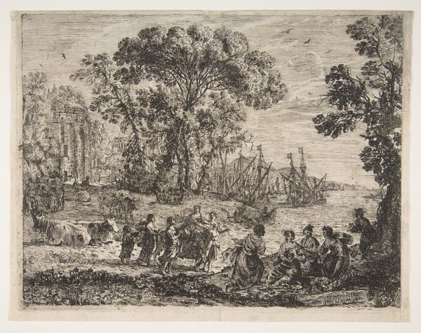 Editor: So, this is Claude Lorrain's "The Rape of Europa," a small etching. The detail is incredible! All those tiny lines creating depth. What strikes you about it? Curator: I'm drawn to the etching process itself. Think about the labor involved, the repetitive action of creating those lines. It transforms a mythological scene into a commodity, reproducible and accessible. What impact did this accessibility have on the understanding of the myth? Editor: So, it's less about the story and more about how it's made and spread? That's interesting. Curator: Exactly. Consider the paper, the ink, the printing press – all materials shaping how this scene is consumed and understood. What does the method of production communicate? Editor: I hadn't considered that before. Now I see how the material changes our perception. Thanks! Curator: My pleasure! It’s about considering the artwork as a product of its time.
