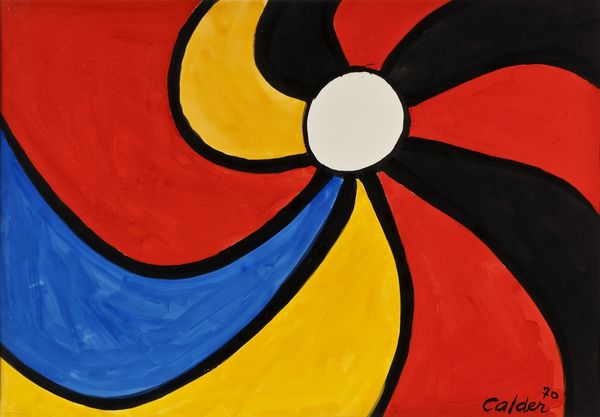 Curator: Alexander Calder’s acrylic painting, "One Black Petal," dates to 1970. Editor: It's strikingly playful, isn't it? The bold colors and simplified shapes immediately grab your attention. There's almost a Matisse-like quality to its exuberance. Curator: Absolutely. What I find compelling is Calder’s consistent commitment to democratizing form. Though largely celebrated as a sculptor, particularly known for his mobiles, his paintings and gouaches also carry the same thread of questioning the established norms and values associated with visual art. Editor: I’m struck by the asymmetry. We have these roughly flower-like forms in yellow, red, blue, and orange but one deviates sharply – a single black “petal.” How do you read this formal divergence? Curator: Within a socio-political context, this distinct petal reads almost as an emblem of resistance. By 1970, many Black artists critiqued the lack of representation and pervasive discrimination in art institutions. So, a solitary dark element amid an array of colorful blooms speaks volumes—a silent rebellion against homogenisation. Editor: Or perhaps the darkness emphasizes the other colors even more, thus calling our attention to how vibrant colors give form a sensation of rhythm. What is rhythm, after all, if not an act of distinction. The hard lines could be an act of definition as well. The lines between Fauvism and Abstract Expressionism are blurred here, as are the very definitions we apply to “painting.” Curator: Certainly. I think that Calder's use of seemingly straightforward forms, like these floral motifs, should be examined as a statement regarding accessibility and representation. They question, "Who gets to see themselves, or parts of their experience reflected?" And “Who decides those standards of visibility?” Editor: Thinking purely structurally, it presents an arresting contrast—a disruption of pattern that forces the eye to reconsider the balance and the arrangement. It’s visually intriguing, and there's an underlying tension from the sharp demarcation of colors that plays on our sense of depth and surface. Curator: Yes. This dialogue between playful formalism and profound implications showcases art’s enduring capacity to question the status quo and reframe what constitutes 'beauty' and ‘inclusion’ in a creative landscape. Editor: Indeed. It’s pieces like this that show how simplicity in visual form can evoke such depth and nuance, keeping art ever relevant, isn't it?