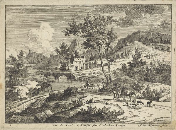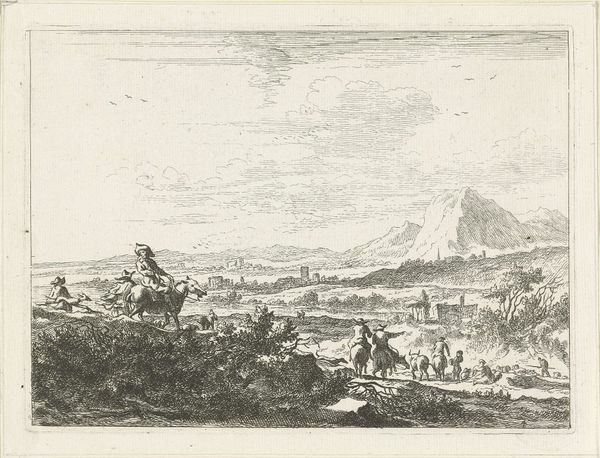 This landscape with figures and town is an etching made by Jan van Huchtenburg. The composition is cleverly structured around a series of receding planes, each defined by distinct activities and forms. In the foreground, we observe figures at rest, subtly guiding our gaze towards the bustling town in the distance. Huchtenburg employs a delicate yet precise etching technique. The network of fine lines creates a sense of depth and texture, animating the landscape and providing it with a palpable presence. The interplay between light and shadow, achieved through varied densities of line work, enhances the pictorial depth, further drawing the viewer into the scene. In the semiotic language of landscape art, this work doesn’t merely represent a physical place. It is a construction of space, imbued with cultural meanings and social values of its time. It invites us to consider how landscapes are depicted and how such depictions reflect and shape our understanding of the world.