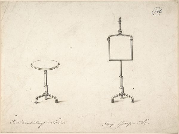 This is a drawing entitled 'Two Designs for Flower Stands' by Robert William Hume. The image shows two different flower stand designs, their forms clearly articulated with light and shadow. The stand on the left presents a rectangular top, while its counterpart features a circular surface. Both are raised by ornately decorated, slender columns. The visual rhythm is created by the repetition of curvilinear elements. The careful attention to detail suggests an engagement with prevailing aesthetic principles of the time, perhaps reflecting broader artistic and philosophical concerns. The artist employs line and shading to create volume, enhancing the sense of depth and three-dimensionality. Note how this drawing exemplifies the role of design in shaping our everyday surroundings and reflects the cultural values attached to objects.