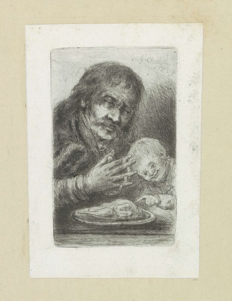 This is an etching by Jan Chalon, made in the 18th century. It depicts a man and child at a table. Notice how the composition is structured around contrasts in texture and light. The artist uses a dense network of fine lines to create a sense of depth, particularly in the man’s face and clothing. The use of hatching and cross-hatching is strategic, building up darker tones to emphasize the shadows, which in turn, gives the figures volume and weight. This contrasts with the smoother areas, such as the child's face, where lighter tones convey softness. The table and the food upon it are rendered with simple, economical lines, anchoring the figures in their immediate environment. The image is more than just a depiction of a man and child. It is a study in contrasts, using the formal elements of line and tone to create a compelling emotional narrative. The etching captures the way simple forms can convey complex feelings, inviting us to interpret the relationship between the figures and the world they inhabit.