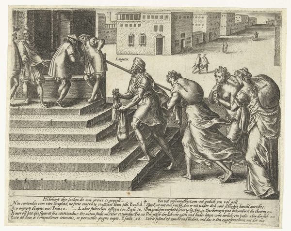 Curator: Here we have Hendrick Goltzius’ engraving, "Mijn en dijn verjagen Eendracht, Liefde, Vrede en Vreze Gods," created in 1597. It's currently housed in the Rijksmuseum. Editor: Whoa, that's a mouthful, even for a title! My initial impression is...chaos. It's like a freeze-frame of a domestic drama turned street brawl, rendered with such incredible detail. So many fleeing figures! Curator: Indeed, it's a highly allegorical piece. The title translates to something like "Mine and Thine Chase Away Unity, Love, Peace, and Fear of God." We see personifications of these virtues being driven away by figures representing selfishness and greed. Editor: That makes sense. You can almost feel the panic radiating from the figures of Love and Peace. I see the figures carrying what appear to be hammers… such an overt symbol of violent removal and disregard for tenderness and life. Curator: It's a commentary on the social and religious climate of the time, likely reflecting anxieties about growing materialism and the breakdown of social harmony in the Dutch Republic. Consider how the rise of capitalism was impacting societal values. Editor: The detail is amazing – every fold in the fabric, the expressions on their faces… it's all so meticulously rendered. Although I see the figures symbolizing the concepts mentioned in the title, can this be looked at beyond its sociopolitical significance? As in a universal story about selfishness destroying everything good and pure, maybe a relevant idea for any time in history. Curator: Absolutely. Goltzius uses the conventions of Baroque art, but he also offers us an evergreen reflection on human nature and societal values. The print medium allowed for wide distribution and would’ve ignited contemporary debate among different groups of society. Editor: It makes me wonder what kind of discussions this engraving sparked back then. We dissect it now, centuries later, but it had an immediacy and a cultural relevance that is powerful. Like a social media post with way more nuance. Curator: I agree. And, the fact that we're still contemplating its meaning after all this time speaks to the power of art to transcend its original context and speak to us across generations. Editor: Exactly! Seeing this, now, reminds me of those times when disagreements, small ego fights, ruined the atmosphere. Like... why are we doing this? Is this disagreement REALLY that important to make everyone so unhappy and tense? Curator: Precisely. Art, at its best, holds a mirror to society and forces us to confront uncomfortable truths. Hopefully, this print challenges viewers even now. Editor: Here's to hoping it does. Next time, let's try to pick something lighter!