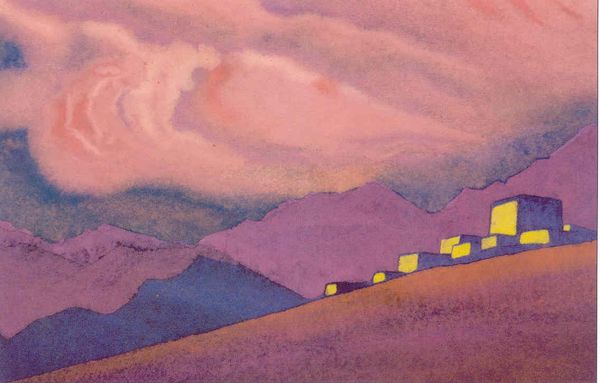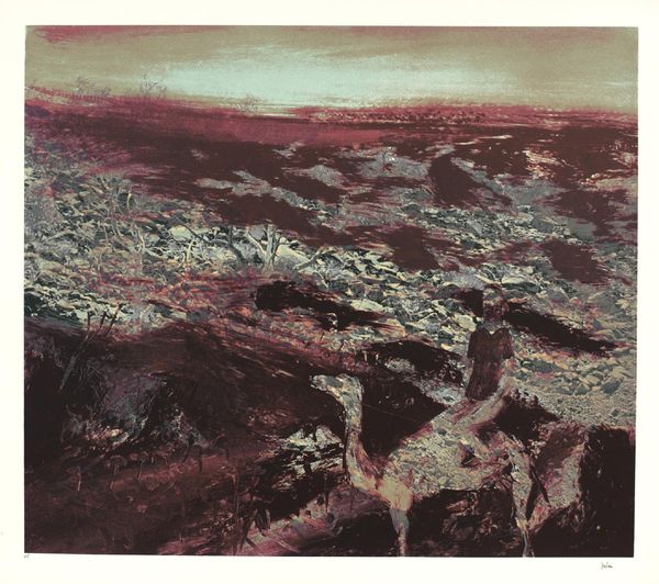 Editor: We’re looking at Ernst Fuchs' "Southern French Landscape," created in 1986 using acrylic on canvas. The color palette is just captivating. I’m struck by the interplay of light and shadow, and the vibrant pink hues in the sky above this mountainous landscape. What symbols or hidden meanings do you perceive in this seemingly simple depiction of nature? Curator: Landscape itself, especially after the Romantic era, often serves as more than just scenery. Here, the way the landscape is rendered, the colors chosen – particularly that roseate sky – evoke a specific emotional and perhaps even psychological space. Does that pink sky suggest a dreamlike, ethereal quality, or perhaps something more unsettling, given its contrast with the darker, more earthy tones below? Editor: I see what you mean! It feels almost like a reflection of an internal state rather than an external observation. Are the geometric shapes significant here too? Curator: Exactly! Fuchs' leaning towards geometric abstraction, while rooted in Expressionism and Neo-Expressionism, could suggest an attempt to find underlying structures, almost a hidden architecture, within the natural world. It echoes a historical desire to unearth essential, symbolic forms – connecting, perhaps, to alchemic traditions or even early cosmology where landscapes held encoded meanings. The use of these repeated geometric shapes gives us pause. What feeling is conveyed to you when looking at this unique blending? Editor: I hadn't considered those historical links, that’s fascinating. It shifts the whole experience. It feels less like a painting of a landscape and more like a key to some kind of deeper, almost spiritual understanding. Curator: Yes, and consider the cultural memory embedded within landscape painting itself – a lineage of artists using nature to convey not just beauty, but morality, spirituality, even national identity. With Fuchs being a Neo-Expressionist, how much is he subverting or playing with those established codes? Editor: That's such a thoughtful consideration. I see so much more nuance and depth than I initially did! Curator: And hopefully that encourages a closer look at our own internalized codes of representation, when considering the images that move us.