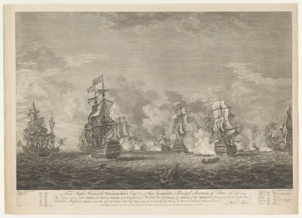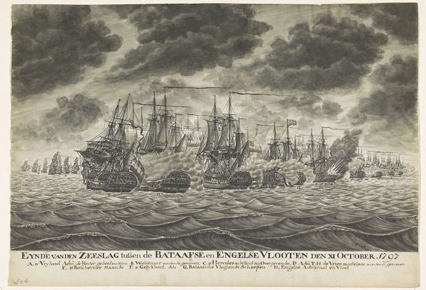 Curator: Think about the drawing, engraving, and pencil work involved. These aren't spontaneous, impulsive acts; they are the result of deliberate decisions. How does the choice of these specific materials and techniques affect your interpretation? Editor: Well, we're looking at Frans Anton van Spijck's "Begin van de zeeslag bij Kamperduin, 11 oktober 1797," made between 1797 and 1798. It's a print and drawing in pencil. The scene feels chaotic, but incredibly detailed given the medium. How do we unpack that contrast between detail and the violence portrayed? Curator: I see it as an illustration of power dynamics. Pencil, engraving – relatively accessible materials, creating an image of naval conflict. Consider the means of production: prints meant for wider circulation. Who was this artwork made for, and what kind of message was it meant to spread? Editor: It was made around the time of the battle, so perhaps propaganda? How would the context of war influence the choice to depict it in a relatively reproducible form? Curator: Exactly. The artist probably wanted to make visible the spectacle of naval power but without the elitism of oil on canvas only accessible to few. The print facilitates distribution to a public, influencing perception through the visual portrayal of that event. Look at the details of the ships, and how they contrast with the abstraction of the waves, smoke and sky... Editor: You're right! Focusing on the individual ships makes them appear grand, complex, and productive centers, versus the waves acting as raw and menacing material... I didn’t think of that. Curator: The process, then, is crucial for shaping meaning. The drawing depicts a kind of material confrontation but also participates to its narrative construction for larger societal consumption. What is your key takeaway regarding the relation between labor, materials and the war portrayed? Editor: By examining its means of production, I’m now aware that its production would shape public sentiment of the battle, something I originally wasn't conscious of.