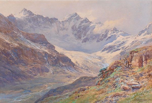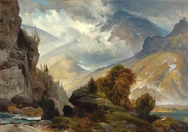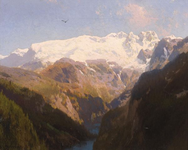 Curator: I find myself a little breathless looking at this scene! Talk about a dramatic view. Editor: Indeed. The piece is titled "Norwegian Highlands, Loerdals Fjord" by Hermann Ottomar Herzog, an artist particularly known for his landscapes painted in the realism style. The brushwork here uses oil paints in the Plein-air method. A wide shot with striking rock and mountain formations. What catches your eye about it? Curator: The scale is astonishing. You can practically feel the crisp, cold air coming off those distant snow-capped peaks. I see such a visual representation of the sublime. The imposing mountain suggests raw, untamed power. It echoes that age-old theme of humanity’s insignificance against the backdrop of nature. Editor: Absolutely, you nailed it! Consider how Herzog's work slots into Romanticism; nature represented more than simple scenery. It becomes a conduit for emotions, reflections on grand universal concepts. Curator: Yes, I agree, nature worship became an expression of profound inner turmoil, hope, or even national identity, really. This work also has a strong element of nationalism associated with it because of the visual imagery associated with the Norwegian highlands. Editor: Exactly, landscapes acquired deep cultural weight. This feels intentional, if you study how the painting plays on contrasts, soft versus sharp, light, and shadow… Herzog even includes birds, adding a dimension of dynamic movement to this huge vista. Curator: The inclusion of life reinforces our awareness of place. Birds in flight create dynamism and contrast against an unmovable natural scene that seems to echo and whisper tales of our collective experiences with such a vast geographical area. There's a story here, passed down generations! It just makes me feel incredibly small and excited by something beautiful and strong! Editor: I wholeheartedly agree. Herzog really captured not only the look but, like you said, that emotional impact. I am humbled to reflect on the painting. Curator: Agreed, the Norwegian Highlands echo something bigger.