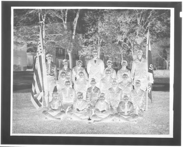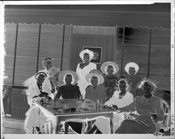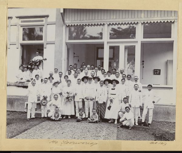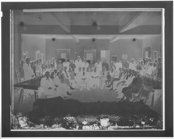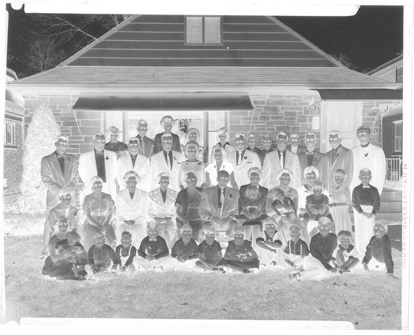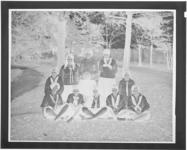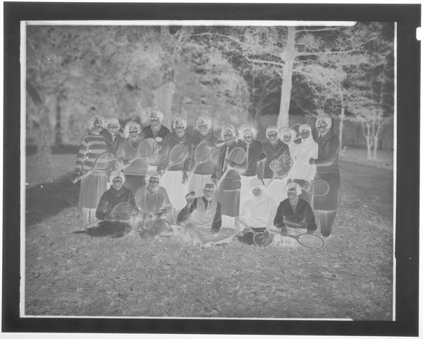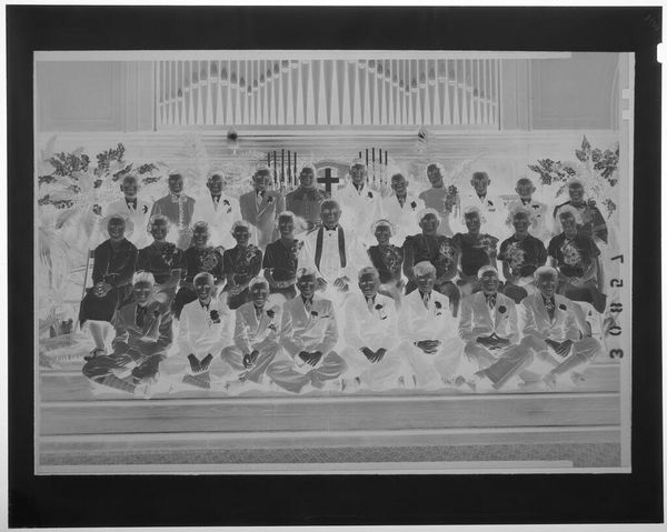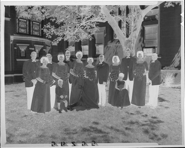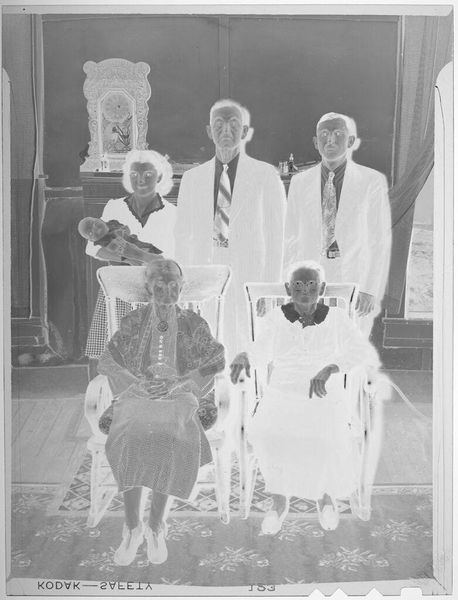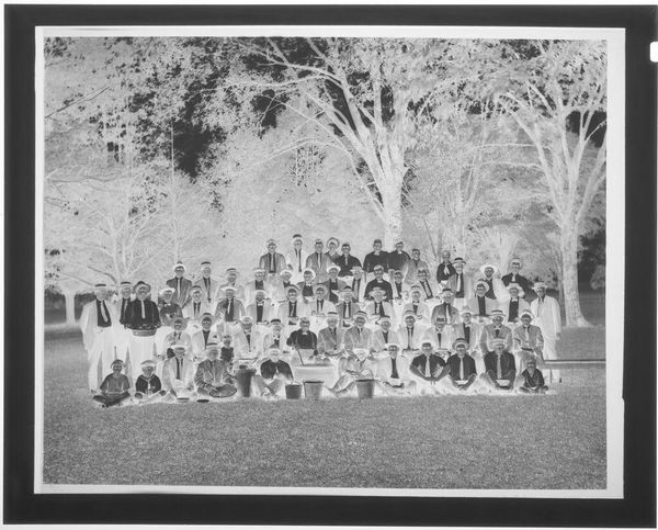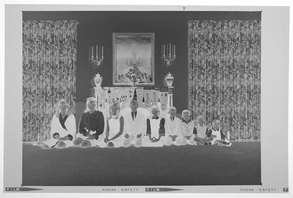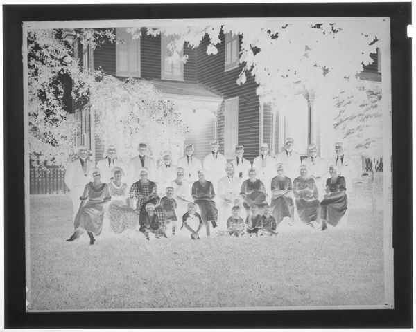 Editor: Here we have an untitled family portrait by Hamblin Studio. The photographic negative shows a large group posed outside a house. What strikes me is the clear labor involved in the creation of this single image; what do you see? Curator: I notice the material conditions immediately. The clothing, the setting, the very act of gathering this many people. It speaks to a moment of aspirational display, facilitated by the studio’s equipment and the family’s resources. Who was this for, and what did it mean to them, to make and consume this image? Editor: So, the photograph becomes an artifact of social and economic realities. Curator: Precisely. It's a record of production and consumption, a family's investment in a particular kind of self-representation. Editor: That's a great way to think about family portraits. Thank you.