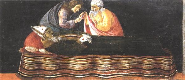Sandro Botticelli rendered "St Jerome in Penitence" as a predella panel for the Altarpiece of St Mark. Observe Saint Jerome, kneeling in the wilderness, a setting laden with symbolic weight, as it represents a space of spiritual trial. His red cloak, a splash of potent color, signifies his cardinal status but also evokes the passion and suffering central to Christian iconography. Note the stone he holds, a tool for self-mortification, echoing ancient ascetic practices. Consider the motif of penitence: the act of seeking atonement is echoed across cultures. From the flagellants of the Middle Ages to the rituals of purification in ancient Greece, the desire to cleanse the soul manifests in myriad forms. Even the desert setting resonates, harking back to the wanderings of the Israelites and Christ's temptation, illustrating how certain symbolic environments become charged with collective memories of spiritual crisis. Botticelli masterfully touches upon the psychoanalytic understanding of guilt and redemption, engaging the viewer in a profound, subconscious dialogue about human fallibility and the yearning for absolution.