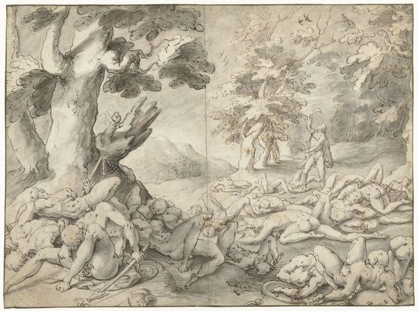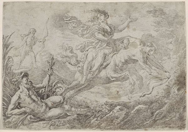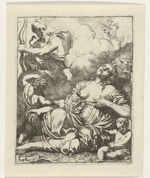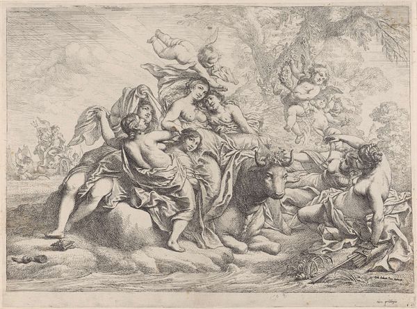 Cornelis Schut made this print, Cimone en Ifigenia, using etching, a technique known for its intricate lines and tonal gradations. The fine lines of the etching beautifully capture the sensuous scene of discovery, a method capable of producing numerous copies, making art more accessible beyond elite circles. Etching involves coating a metal plate with wax, drawing through the wax to expose the metal, and then immersing the plate in acid. The acid bites into the exposed lines, creating grooves that hold ink. The plate is then pressed onto paper, transferring the image. This process allowed Schut to create delicate details and textures, from the pastoral landscape to the figures' reclining bodies. Beyond aesthetics, the process of etching reflects the democratization of art production. Unlike unique paintings or sculptures, prints could be reproduced and distributed, connecting the artist to a broader audience and influencing art and visual culture through widespread imagery. The work involved reflects a shift towards a more mediated and reproducible form of artistic expression.