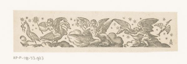 This is a small, anonymous ornamental design, made without a specified date, featuring putti. In Western art history, putti—those chubby, winged infant figures you see here—have often been associated with innocence, love, and divine presence, yet their history is deeply entwined with complex social dynamics. During the Renaissance and Baroque periods, when this type of ornamental design flourished, the image of the putto also served as a symbol of wealth and power, often commissioned by the elite to decorate their homes and objects. These images idealized childhood, while the lived reality for many children included poverty, labor, and high mortality rates. Consider the artist, whose identity is lost to us, and who, through the act of creation, participated in perpetuating the values of their time. This piece invites us to reflect on the stories we tell ourselves about childhood, divinity, and beauty, while challenging us to remember the lives and histories that are often unseen.