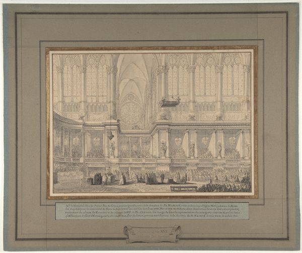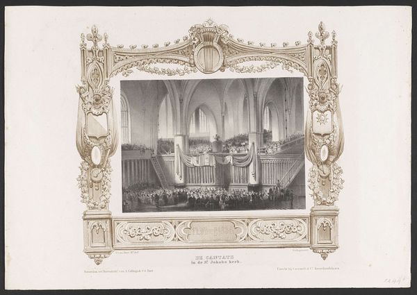 Franciscus Bernardus Waanders created this print of the Foot Washing by the Pope on Maundy Thursday. The work is defined by a strict architectural perspective which creates a deep, receding space, pulling the viewer's eye far into the Basilica. Observe how the artist uses the repetition of vertical lines in the columns to emphasize the grandeur and height of the space, and to convey the power of the church. The controlled lines and structured composition evoke a sense of order, typical of academic art. Waanders frames the scene with an ornate border, contrasting the linear precision within the image. This juxtaposition creates a visual tension, questioning the relationship between the central event and its representation. What does it mean to frame a ritual of humility within such elaborate ornamentation? The combination of detailed interior and decorative frame serves not only to depict but also to interpret the cultural and spatial dynamics of religious authority.