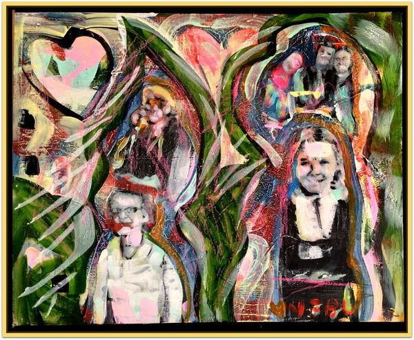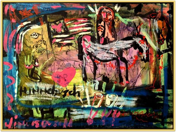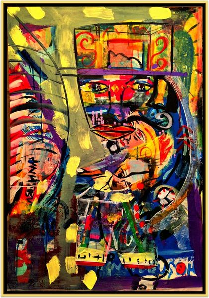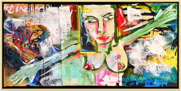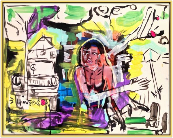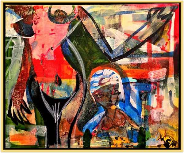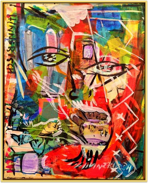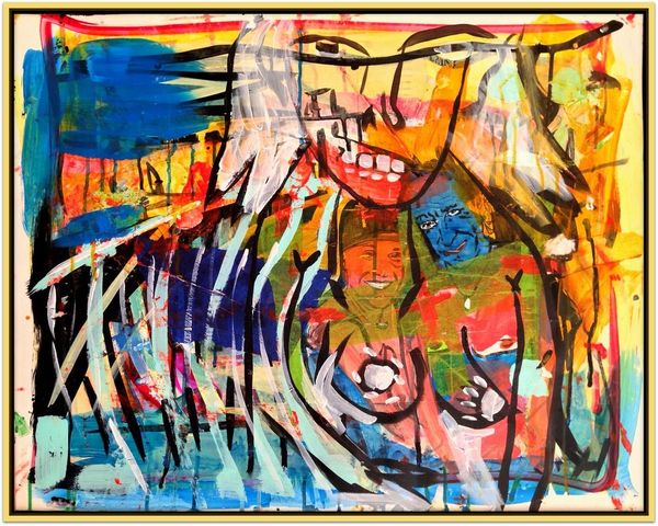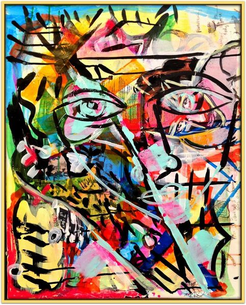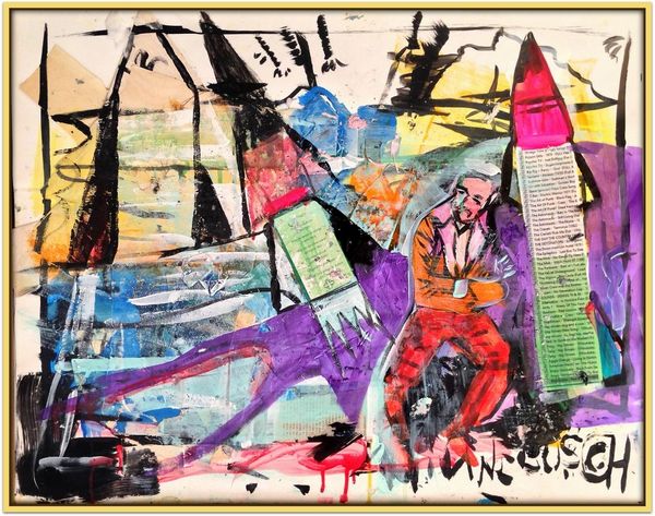 David Michael Hinnebusch created ‘Launch’ with dynamic brushstrokes and vibrant colors. The composition is active, with the figures seemingly caught in a moment of transition or movement. The painting's structure relies on a push and pull between figuration and abstraction. The artist uses bold lines and color to define the figures, yet these elements also dissolve into the expressive background. The geometric shapes and blocks of color challenge a traditional sense of depth, flattening the picture plane and emphasizing the painting's surface. The perspective is deliberately distorted, creating a sense of unease, while the figures themselves appear almost like signs or symbols within the larger visual field. This destabilization of conventional representation invites us to consider how meaning is constructed and negotiated. Ultimately, the painting invites an open dialogue about the nature of perception, identity, and the ever-shifting boundaries between the self and the world.