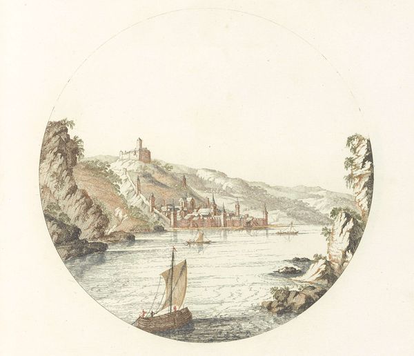 Curator: This intriguing artwork, titled "View of Rhynfels," presents a detailed scene, though its creator remains unknown. It certainly gives a feeling of fairy tales. Editor: It evokes a sense of serenity, doesn't it? The way the water reflects the sky and the imposing structure above. I wonder about the communities that might have resided here over time. Curator: What interests me is the material execution. The subtle coloration, the method of application, and the circular format—it suggests a purpose beyond mere representation. The labor involved. Editor: Yes, and the power dynamics at play in the depiction of this landscape. Who had access to such views, who controlled the resources reflected in them? Curator: I suspect this piece offered some kind of social capital. Editor: It's a potent reminder that even seemingly tranquil landscapes are interwoven with histories of power, privilege, and perhaps even dispossession. Curator: A powerful observation. This artwork serves as a reminder to examine not just what we see, but also how it came to be and who it served. Editor: Exactly. It prompts questions about how we assign value, both artistic and societal, within specific contexts.