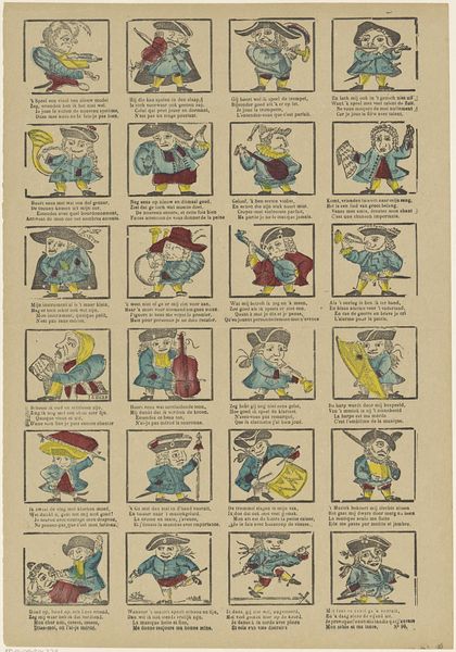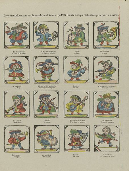 This print, "Groote zang en muzijk van beroemde muzijkanten", was created by Erve Wismuller. It consists of a grid of sixteen small images, each portraying a musician with their instrument. The colour palette is simple with blues, reds and yellows dominating the image. Each musician is framed within a decorative border, creating a structured, almost taxonomic layout, but the cartoonish figures, with their exaggerated features and poses, disrupt any sense of formal order. This tension between structure and playfulness invites us to decode what is being communicated. The semiotic system at play here is a cultural commentary. The print engages with the concept of representation itself. The arrangement of musicians in a grid-like fashion suggests a system of classification. The artist challenges our understanding of representation by turning these musicians into stylized, almost caricatured figures which are more about cultural interpretation and less about true representation.