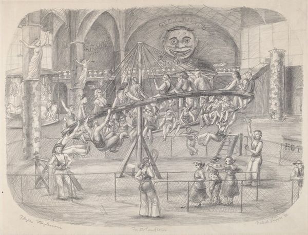 This etching, "Untitled (Deer Dance)," by William Howard Shuster presents a scene with this incredible quality of line that just grabs you. It’s like he's thinking on the plate, figuring out the image as he goes. The texture is everything here, isn't it? Look at the smoke billowing from the building - it's so alive! Shuster coaxes so much out of these tonal variations. And then, your eye wanders down to those figures in the foreground. They feel so grounded. This contrast between the solidity of the building and figures and the ephemerality of the smoke is, to me, what gives the piece its energy and tension. Shuster’s work reminds me a little bit of Marsden Hartley's explorations of American folk traditions. It’s like Shuster is trying to capture something essential about the human experience, a ritual, with no easy answers. I think that's what makes the image so compelling.