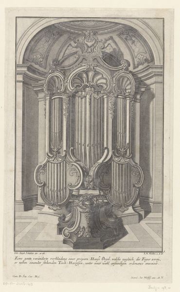 Curator: Here we have Johann Matthias Steudlin’s engraving, "Organ with Putti," made sometime after 1724. Editor: It’s striking how detailed the lines are for an engraving! The architecture and musical instrument almost feel like they’re dominating the space. What jumps out to you when you look at this? Curator: Immediately, I'm drawn to the method of its production. This wasn't simply *drawing*. The lines—the raw material—were created by laborious, repetitive cuts into a metal plate. How do the sharp contrasts, the density of line, speak to the religious function of the space and the musical instrument within it? Think about the labor, skill, and expense required to produce such an image. What was the original use for an image like this? Editor: Well, given that it’s a print, and therefore reproducible, it could have served a didactic purpose – illustrating contemporary organ design? Maybe to influence further commissions of such baroque-style organs in churches? Curator: Exactly! It also serves to disseminate stylistic preferences of the time. Consider, too, how the materials of this piece--paper, ink, metal plate--democratized access to images, compared to frescoes. Before printmaking, only the elite could access certain visual styles. This print brings ornate architectural design to a broader audience. Editor: That makes me think about the economics of art production, and how innovations in materials impact not just style, but social access. Curator: Precisely. Think about the engraver as a skilled laborer, replicating designs, fulfilling market demands, and shaping visual culture. So much more than *just* an artwork, isn't it? Editor: Definitely given me a lot to think about, looking beyond just aesthetics and thinking about how these images were actually made and circulated in society!