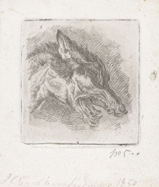 Jacobus Cornelis Gaal created this etching of a wolf's head with an open mouth. The texture in this artwork comes alive through the artist's use of line, each stroke carefully placed to define the form and convey the animal's raw energy. The rapid, almost frantic lines capture the texture of the wolf's fur. The sharp lines depicting the teeth and jaw are in stark contrast with the softer shading around the neck. This differentiation creates a compelling visual tension and underscores the dual nature of the wolf—ferocious yet vulnerable. Through Gaal’s technical skill, we see how the structure of line and form can communicate complex ideas about nature and its untamed essence.