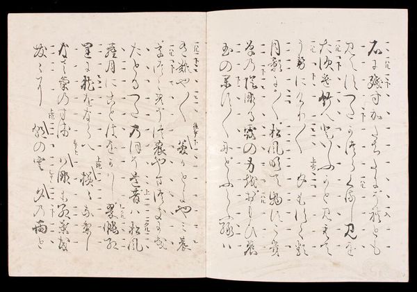 Curator: Here we have an open book, showcasing calligraphy titled "Suma, Chapter 12 of the Tale of Genji (Genji monogatari)," in the style of Monk Jien. Editor: Whoa, that script is intense! Like black ink vines crawling across a parchment landscape. I can almost feel the writer's hand, the controlled frenzy. Curator: Indeed, the Tale of Genji is a cornerstone of Japanese literature, and Jien was a poet and Buddhist monk during the late Heian and early Kamakura periods, a time of significant social and political transition. This work is now held at the Harvard Art Museums. Editor: Transition, huh? Makes sense. There's a tension in that flow, a sense of stories wanting to burst out, to spill secrets. You can feel the weight of history, but it’s all happening right now in these brushstrokes. It's quite stunning, really. Curator: It's a fascinating intersection of text, image, and historical context, a window into a world that continues to resonate today. Editor: Exactly. It makes me want to pick up a brush and try to capture my own chaotic story—though I doubt it would look as elegant.