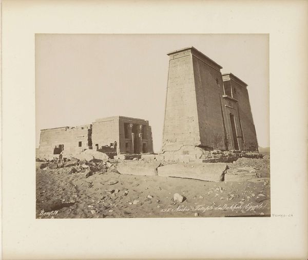 Curator: Looking at this daguerreotype by Félix Teynard, entitled "Dakkeh (Pselcis), Vue Générale du Temple," created between 1851 and 1852, what immediately strikes you? Editor: A kind of stark desolation, wouldn't you say? The structures look imposing, but small in contrast to the expansive sand. It suggests both permanence and fragility. Curator: Precisely. Consider the colonial context. Teynard was part of an expedition following Napoleon’s earlier ventures. His photographs served to document and, in a way, claim this space through visual representation. How do we grapple with the ethics of such visual archiving today, when these images were made with specific power dynamics at play? Editor: Well, the temple itself becomes a signifier of endurance, outlasting empires. Temples have always stood as symbols of societal order, acting as sacred grounds with significant power. But through Teynard's lens, the human element is almost absent, accentuating the symbolic authority and permanence of the sacred monument over temporary political agendas. Curator: And how do we interpret this absence? It's tempting to read the depopulated scene as an assertion of colonial power – a blank canvas for imperial projection. However, the visible deterioration of the temple also speaks to a disruption of that perceived power dynamic. The ruins push us to question these claims of dominance. Editor: Indeed. These Egyptian ruins communicate a kind of memory – visual and cultural. The symbolism in the temple's architecture - now faded – remains deeply rooted in its cultural function, and even in its current ruinous state, offers historical testimony to something beyond purely political maneuvering. Curator: Absolutely. When engaging with artworks from such charged contexts, the challenge lies in confronting these histories head-on, acknowledging the complicated relationship between artistic creation and its implications for cultural understanding. Editor: It’s that act of acknowledging what's gone and finding new perspectives on what endures. An interesting reminder of the long echoes of history in visual culture.