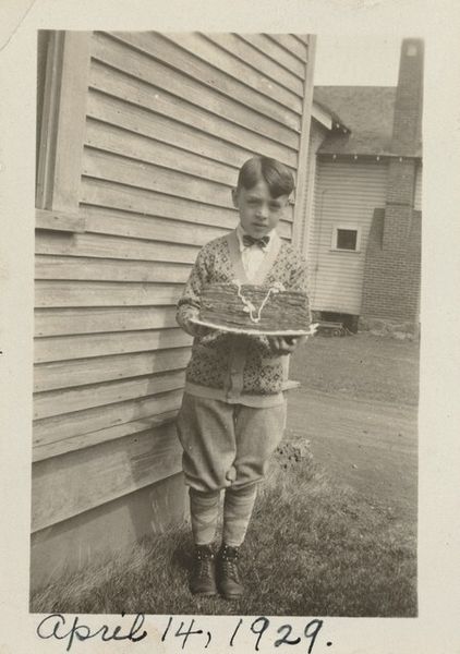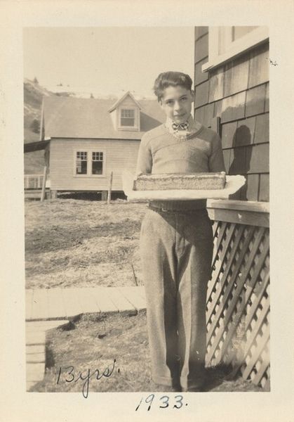 This photograph, inscribed "13 yrs old. April 14, 1933", presents a study in monochromatic tones and geometric forms. The subject, a young boy, is centered, holding a rectangular cake emblazoned with the name "Edward." The composition emphasizes the interplay between light and shadow, which defines the boy's features and the architectural backdrop. Note how the rigid lines of the house siding contrast with the soft curves of the cake's decorative trim and the boy's clothing. This opposition generates a visual tension, a subtle destabilization of formal expectations. The photograph’s muted palette evokes a sense of nostalgia, while the clear inscription anchors the image in a specific time. It freezes a moment in the subject's life, prompting reflections on identity, aging, and the human relationship with time itself. The inscription serves as a structural element, framing the image with historical context and challenging its reading as a purely aesthetic object.