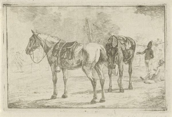 Joannis Jacobus Bijlaert created this drawing, "Ruiter naast pissend paard," using pen in gray-brown ink on paper. The composition is dominated by the figure of a horse, centrally positioned and captured in the very act indicated by the title, alongside a standing rider. The artist’s choice to depict this everyday, almost vulgar, moment disrupts traditional heroic or noble depictions of horses and riders. This shift in subject can be interpreted through the lens of semiotics, where the usual signs of equestrian portraiture are subverted. The act of urination, typically unseen, introduces an element of realism that destabilizes the idealized representation. Bijlaert’s work engages with notions of authenticity and challenges fixed meanings associated with status and decorum. The seemingly minor detail becomes a focal point, inviting viewers to reconsider established artistic conventions. It compels us to reflect on how even the most quotidian actions can disrupt established categories of representation.