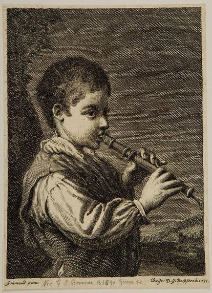Curator: Here we have "Fluitspeler," or "The Flute Player," an etching dating back to 1741, created by Johannes de Groot the Younger and currently residing in the Rijksmuseum. Editor: The shading gives it an almost dreamlike quality, like a memory half-faded. I am also very drawn to the texture and the layering within the natural environment. Curator: Absolutely, the soft strokes of the etching really do create an intimate scene. Given the period, let’s consider the connotations around musical performance, especially as portrayed in genre paintings. Was this skill accessible to everyone, and how does that speak to class structures? The boy seems unidealized. Editor: You know, my eye goes straight to the instrument. Its material construction – most likely wood – combined with the breath and the human touch of the musician to create sound is an intimate combination of labor, consumption, and social practices, very grounded and present. The process is just as crucial as the final image. How might such seemingly "mundane" cultural practices intersect with greater political currents? Curator: Precisely! By the mid-18th century, ideas about sentimentality and feeling were becoming central to discussions of virtue and taste. Seeing a common person engage in musical expression was a statement about broader access to higher feelings. Editor: I suppose for me, analyzing the context behind the artistic choice helps me dive into the work in a more meaningful way, appreciating the skill while questioning whose stories and whose experiences are being privileged or ignored within such work. Curator: And that intersectional approach allows us to examine and challenge art history and social power structures that helped define not just what gets created but how it circulates! Editor: Yes, considering process and labor helps peel away at such questions. Curator: Indeed. Looking at "Fluitspeler," we've both found ways to understand the intersectional stories within this etching. I hope visitors find similar connections! Editor: Definitely a work to ponder regarding materiality, labor, and meaning in our modern context.