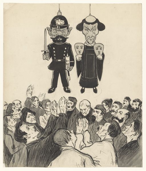 Curator: Ah, yes, here we have "On dit que les Parisiens...", a lithograph created in 1864 by Honoré Daumier. The full inscription translates to “They say Parisians are hard to please, [yet] on these four benches not one grumbles – true, these Frenchmen are Romans.” Editor: Well, my first impression? Slightly unsettling. Like a horde of happy zombies trapped in eternal applause. It feels...crowded. Almost suffocating, like trying to navigate the Metro during rush hour. Curator: The sheer density of figures certainly creates a sense of overwhelming sameness, but that's part of the satirical intent. It echoes Daumier’s frequent criticism of bourgeois society and its sometimes mindless approval of spectacle. The smiles, are they genuine or merely performative? The Romans are being referenced as spectators in a gladiatorial show, highlighting perhaps, how audiences can be easily swayed. Editor: Performative! Exactly! They are almost robotic in their unison. The eyes especially. They're all fixed, vacant even. And there is an odd juxtaposition of high society – suits, waistcoats – with something deeply primal. What's the narrative here? What are they watching? Curator: The implied spectacle is secondary; Daumier is primarily interested in the reaction, the mass psychology. He uses caricature to reveal what he perceives as the hypocrisy and superficiality beneath the veneer of respectability. The graphic quality itself, the stark contrasts of light and shadow achieved through lithography, heighten the dramatic and cynical impact. Think of how collective behavior can lead to both cultural continuity and periods of great collective madness. Editor: It reminds me a bit of political rallies these days – all those smiling, adoring faces. Gives you the shivers, right? Curator: Indeed, Daumier captures something timeless about human nature, about our tendency to conform and be swayed by the crowd. It's not just a depiction of 19th-century Parisian society, but a reflection on how we behave en masse, still valid now, 160 years later. Editor: So, in a way, it’s a rather cynical reminder of our own susceptibility. We like to think of ourselves as individuals, but maybe we're all just happy zombies clapping along to something we don't even understand. Heavy stuff. Curator: Yes, quite the commentary, don't you agree? A powerful reminder. Editor: Agreed. Something about its stark honesty keeps resonating in my thoughts... Definitely made me look at crowd dynamics differently, in the theatre and elsewhere.