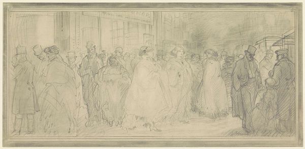 Editor: Here we have Thomas Stothard's "A Wedding Procession" from the Tate Collections. It’s a small sketch, and the figures seem to emerge from the pale wash. What do you see in this piece, beyond the apparent subject matter? Curator: The dynamism lies in the interplay between line and wash. Notice how Stothard uses a spare, almost hesitant line to define form, particularly in the drapery. Where does the eye travel, and why? Editor: I think my eye is drawn to the figure in the center foreground, where the lines are darkest. Curator: Precisely. The contrast there creates a focal point, but it is the repetition of forms that truly holds the composition together. The arches in the background and the rounded heads mimic each other. It all contributes to a sense of formal harmony. Editor: I see that now. It's like a conversation between shapes. Thanks for pointing that out. Curator: Indeed. Stothard’s focus on form and structure elevates the work beyond a mere depiction of a wedding.