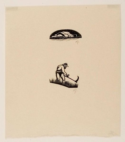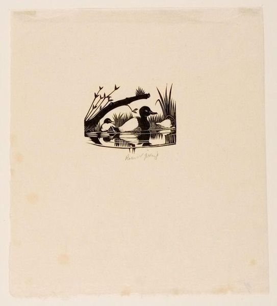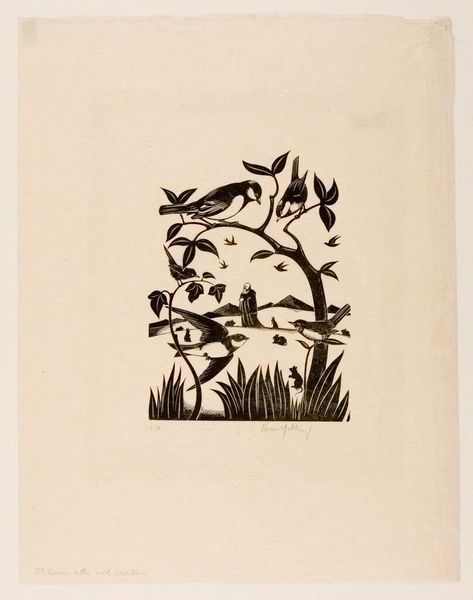 Editor: We're looking at Robert John Gibbings' wood engraving, "Charm of Birds: Illustration One," at the Harvard Art Museums. It has a very folksy, almost naive quality, with the thatched huts and birds. What strikes you about this work? Curator: The intentionality of the black and white contrast invites critical discourse about colonialism. The "charm" could be interpreted as a romanticized lens through which Gibbings, a white artist, views a culture other than his own. Editor: So, the idyllic scene could mask a more complex power dynamic? Curator: Exactly. We must examine whose stories are being told and how. Does this work perpetuate or challenge existing colonial narratives? Editor: That gives me a lot to think about! It's a reminder that even seemingly simple images can have deep roots in history and power. Curator: Precisely. It's about questioning and engaging with the art, its historical context, and its implications.