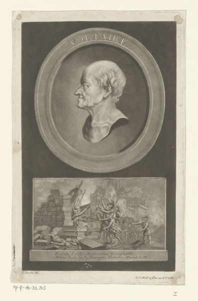 Curator: This is Daniel Nikolaus Chodowiecki’s 1774 engraving, “Portret van Christian Wilhelm Ernst Dietrich,” held here at the Rijksmuseum. Editor: The monochrome palette lends a timeless gravitas. Its fine lines and formal composition suggest a moment captured with neoclassical restraint. But there's a hint of something...I want to say vulnerable...in the subject's gaze. Curator: The print is an interesting specimen of artistic labor. Chodowiecki, who was active in both Berlin and Danzig, expertly transferred an image to a metal plate, likely copper, using a burin. This engraving process, with its precise tool work, allowed for multiple reproductions, democratizing access to this likeness. Think of the implications for the circulation of ideas at that time. Editor: Absolutely. The dissemination of portraits, especially of those in positions of power or influence, played a crucial role in shaping public perception. But, looking closer, I wonder, who was Dietrich, and how did his identity intersect with the societal norms represented here? The stoic image, framed like a classical bust on a pedestal, appears to reinforce a particular image of masculinity and status, right? The medium itself would contribute to the construction of such perception, no? Curator: Precisely. The labor of reproducing and circulating images cemented certain social narratives. As for Dietrich, he was a well-regarded painter; the engraving acts, in a sense, as a commodity itself, an artifact celebrating artistry. Editor: And further amplifying the artistry. How do we disentangle this celebration from broader discussions of artistic patronage? Considering Chodowiecki's own artistic ambitions and the social dynamics embedded in portraiture... Curator: Food for thought, certainly. Thank you for highlighting these fascinating elements. I think it provides a rich, layered reading. Editor: Thanks. Engaging with an artwork always prompts us to revisit historical constructions through today’s critical lenses.
