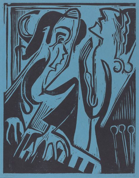 Editor: We're looking at Carl Robert Holty's "Untitled (Abstraction: Woman at Table)," a 1937 woodcut. It’s all sharp angles and contrasting black and white. I find its visual vocabulary quite arresting. What initially stands out to you? Curator: Well, isn't it interesting how Holty teases us with "Woman at Table" yet dissolves the figure into geometric musings! The tension between the implied subject and the abstract shapes – almost landscapes within the figure - sets the stage for endless personal stories. The limited palette forces us to really "see" the textures and patterns he coaxes from the woodcut technique. Do you get a sense of the time period in it, that pre-war tension? Editor: I can definitely see the angular forms that pull from Cubism, with its breakdown of perspective, that speak to those times. I wonder about the narrative implied; is it really about a woman at a table or is the table just a scaffolding to explore the forms themselves? Curator: Exactly! Perhaps it’s less about portraying a literal scene and more about a feeling, an atmosphere suggested through form. See how the lines almost vibrate, like a held breath? Maybe the “woman” isn't the point, but a key. Perhaps Holty sought to distill essence itself through pure geometry. It begs us to wonder what “essence” Holty seeks... perhaps human essence? Editor: That's a cool idea, actually. It is interesting how it suggests figure, space, still life. Thanks! I'm definitely rethinking my initial reaction. Curator: Wonderful, art should never settle but instigate. It seems he lets forms speak with surprising freedom here, leaving us wonderfully unsettled, in a beautiful way of course.