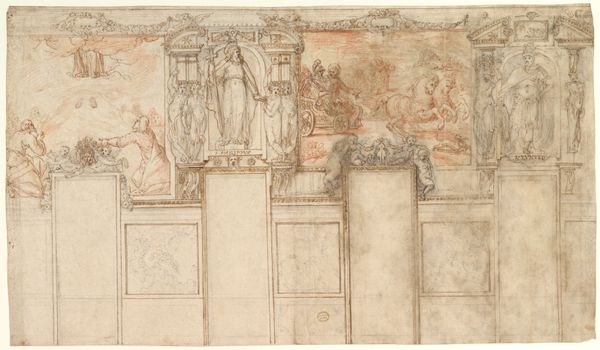 Editor: So, this is "Design for a Funerary Monument" by Francesco Salviati, a drawing intended for a marble carving, from the Renaissance. It has a slightly eerie feel to it, what with all the skulls. What stands out to you in this drawing? Curator: Oh, isn’t it glorious? It’s more than just skulls, isn't it? It's a stage, a drama! Notice how Salviati’s playing with different planes. Death and the maiden are right there on top, grasping some, ahem, celestial geometry, maybe staking their claim for the heavenly real estate. And look at those little figures with spears down below, guarding the oval space meant for some bigwig's name. Makes me wonder, what story were they hoping to tell? Who was important enough to get this design? Editor: The composition is really intricate. Do you think this drawing was typical of Renaissance funerary art? Curator: Typical, perhaps not. But evocative? Absolutely. The Renaissance, you know, wasn’t shy about putting death on display. It was part memento mori, part status symbol. It makes you ponder, doesn't it, how much we’ve tried to sanitize death these days? Were they braver, staring it down, or are we, trying to look away? It makes me think about the role art plays in how we grieve and remember. Editor: It does make you think, seeing death so prominently depicted. It also hits me how death, though a bit morbid, was handled with beauty in older times. Thanks for making this clearer! Curator: My pleasure! And thanks for giving me a chance to wander through the shadowy gardens of remembrance. Always a trip, isn't it?