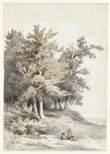Editor: So, here we have Samuel John Stump’s “Gainsborough’s first sight of the young lady who,” from around 1830, housed right here at the Art Institute of Chicago. It's rendered in pencil, ink and watercolor on paper. There's a delicate quality to it. It feels… dreamlike, almost. What do you see in it? Curator: Dreamlike is spot on! To me, it’s like stumbling upon a half-remembered story, a little vignette glimpsed through a misty lens. Consider the very idea Stump puts forth; it's a "first sight". Do you get a sense of that instant, that electric connection maybe, between Gainsborough and his subject? It’s a beautifully rendered "meet cute" of the Georgian era. What draws your eye in, compositionally? Editor: I'm struck by how Stump plays with light and shadow. It directs your gaze to the woman, with her sheep in tow. The way Gainsborough, presumably, is tucked away in the lower right, almost secondary, even though the title suggests he’s central. Is he really seeing her for the first time, or is it more… constructed? Curator: Aha! Exactly! I suspect the emphasis isn’t solely on biographical accuracy. I imagine it's Stump offering his interpretation of artistic inspiration. The light bathing the "young lady," it's as if nature herself is presenting her as *the* muse. Notice how Stump contrasts Gainsborough, firmly planted and earth-bound on his stool, with the floating light illuminating his subject! Is there an almost *voyeuristic* quality? Editor: Absolutely. Now that you point it out, the whole scene does have this feel of stolen observation, an almost cinematic first encounter! Curator: Precisely. Stump’s turned biography into artistic license and he shares the excitement and nervousness that maybe Gainsborough himself would have experienced. I leave with an elevated, Romantic understanding. What are you taking with you? Editor: That this piece is far more than just a record of a historical meeting. It's a meditation on seeing and being seen, interpreted by Stump as a story of a spark. And perhaps that’s art in a nutshell, right?