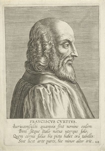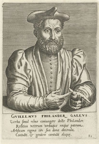 Editor: Here we have Philips Galle's "Portret van Gian Battista Gelli," created in 1572. It's an engraving, a print, held at the Rijksmuseum. The portrait feels incredibly serious; Gelli's gaze is so intense. What do you see when you look at it? Curator: I see a man consciously constructing his legacy. Every line, every shadow, is deliberate. Notice how the beard dominates the composition, a symbol of wisdom, age, and experience. Do you think that’s incidental? Editor: Not at all. I'm curious about the text below the portrait. Is it meant to amplify the symbolism somehow? Curator: Absolutely. Text and image were inextricably linked. "Baptista Gelli, Philosopher." The poem that follows highlights Gelli’s virtues and dedication to study, "Ambitione procul qui coluit studia" – "Far from ambition, he who cultivated studies." Editor: So, the image is really about presenting an ideal of learned virtue? Curator: Precisely! It is a very human, conscious attempt to use image and word to shape public memory, to establish a certain image of who Gelli was, and should be remembered as being, for posterity. The very specific styling— the limited contrast, the fine lines— contributes to this impression of dignified stoicism, a carefully crafted persona meant to endure. What lasting impression do you believe this artwork would have on the viewer? Editor: It makes me think about how we carefully build our own images today on social media, for instance. A Renaissance philosopher and an Instagram influencer, maybe not so different after all. Curator: Indeed, this print connects us to a lineage of carefully curated selves, reflecting our constant negotiations between the private and public persona.