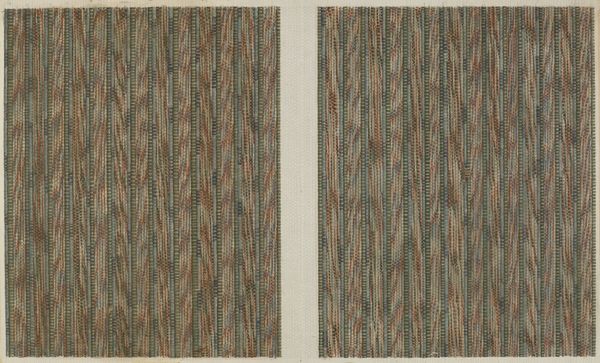 Curator: So, here we have what’s described as a “Sheet with overall red and green vine and dot pattern.” It’s dated sometime between 1750 and 1816, currently residing at the Metropolitan Museum of Art. Editor: It has an undeniable sense of order, almost soothing in its predictability. Curator: Precisely. What intrigues me most is how simple shapes can evoke such a feeling. These red floral clusters nestled in between sawtooth bands evoke organic growth confined to the vertical axis. Does that limitation strike you as intentional, or perhaps a technical constraint? Editor: It whispers stories of gardens and wallpaper, but also of hidden constraints. It's interesting how such an orderly pattern evokes both growth and constraint simultaneously, suggesting a deeper narrative perhaps of societal expectation against the unruliness of nature. The dots create an implied movement, a quiet pulse underlying the more overt vine and floral design. They remind me of cosmic dust. Curator: A cosmic underpinning for an everyday textile... I like that thought! Perhaps it mirrors how humans attempt to tame and understand chaotic events. To see universal forms in something meant to decorate our homes says a lot. What do you think someone at the time would experience by simply handling this fabric? Editor: Possibly a subtle encouragement towards conformity, but paradoxically within that a contained celebration of nature. Those little bursts of red amidst all that regimented green... Perhaps even a longing for a life that strays outside imposed designs. These printed symbols often served not only decoration but reminders about status and social standing within domestic space. The patterns people chose spoke to values, and their aspirations Curator: It's lovely how a relatively minor piece—really, it's just a fragment—becomes a window into these social frameworks. It makes you appreciate just how carefully designed our surroundings are. Even simple textiles were laden with layers of intentional and perhaps unconscious symbolism. Editor: Exactly! And once one becomes attuned to that language, one hears whispers everywhere. Thanks for that brief but inspiring glimpse into this fabric's secrets!
