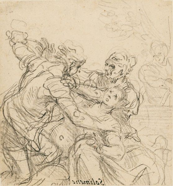 Curator: Telemachus slaying the lion. This pen and ink drawing by Bernard Picart, created between 1683 and 1733, is currently housed in the Rijksmuseum. It's quite striking, wouldn't you agree? Editor: Indeed. My immediate response is drawn to the visible struggle within the rough marks; the materiality of the sketch itself embodies that tension. It appears quickly rendered, almost as if captured on the spot, lending a sense of immediacy. Curator: That energy really comes across. Considering the mythological narrative, this is more than a simple fight. Telemachus, son of Odysseus, becomes a symbol of inherited strength, echoing his father’s legacy as he conquers the beast. What does the sketch reveal to you about labor, and class in this narrative? Editor: The swift pen strokes indicate perhaps preliminary workings—perhaps it was more about process rather than product, you know. In other words, the art of practice itself, and in its raw nature, it removes any pretense that high art holds versus the everyday workings of a draftsman’s labor. It hints at production without high-end polish. Curator: Absolutely. Picart was engaging with narratives common in his time. But consider the symbolism – the lion, often associated with royalty and power, is challenged and ultimately defeated by a younger hero. It brings forward ideas of changing social orders. Who wields the actual tool? How can marginalized communities rewrite and redefine these narratives? Editor: That brings forward issues of class! By demystifying the artist's hand and displaying it in a state of rough material, he exposes production practices. Moreover, the artist can be considered as a craftsperson here. It all contributes to a deconstruction of that idea that "fine art" somehow remains distant or sacred... I think that there are other dimensions here at play. Curator: I agree. The very act of drawing and the marks left behind represent more than a technical skill; it's a conscious claiming of representation. Looking at Telemachus then reveals how the historical context can highlight critical conversations surrounding empowerment, identity, and perhaps collective emancipation. Editor: Fascinating. Well, the unpretentious materiality has certainly shifted my perceptions here. The focus on materials—pen, ink, and paper—pushes forward considerations beyond mythic heroism. Curator: I'm walking away reconsidering both how and whose stories are told, and how art can advocate for these conversations.