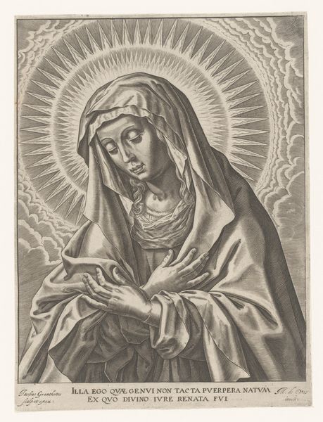 Elisabetta Sirani created this etching of the Virgin Mary in the 17th century. Sirani was one of the first women artists to achieve international fame, in a time when women were largely excluded from the art world. Here, Mary is depicted with a gentle and serene expression, her eyes cast downward in contemplation. The fine lines of the etching capture the soft folds of her robe and the delicate features of her face. Sirani's decision to portray Mary in such a tender and human way challenges the traditional, often idealized, representations of religious figures. By focusing on Mary's inner thoughts and emotions, Sirani invites us to connect with her on a more personal level. Consider how Sirani, as a woman artist, might have brought a unique perspective to this portrayal of the Virgin Mary, infusing it with a sense of empathy and understanding that resonates across centuries.