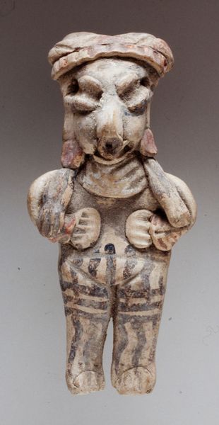 This terracotta figure, made by an artist from Nayarit, Mexico, stands as a testament to the region's rich artistic traditions. Notice the figure's seated posture, its crossed legs creating a foundational symmetry upon which the rest of the composition builds. The arms, one holding a spherical object, contribute to a dynamic interplay of shapes, enhanced by the warm, earthy tones of the terracotta. The surface is textured, creating a tactile sense that is further complicated by the intricate patterns adorning the figure’s torso and face. These designs, angular and precise, introduce a layer of complexity. The figure embodies a structural duality, balancing the simplicity of form with the complexity of decoration. This tension is at the heart of its enduring appeal, inviting us to contemplate the figure's cultural significance and the artistic vision behind its creation. It challenges fixed meanings, encouraging endless interpretation and reinterpretation.