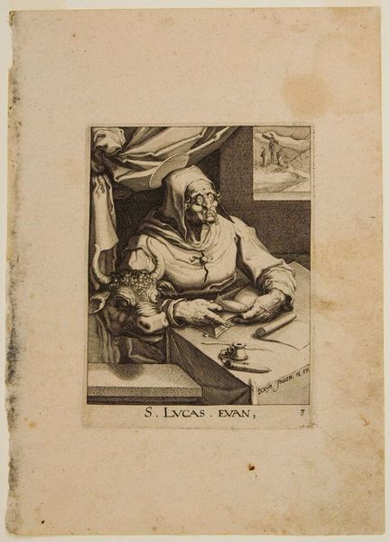 Curator: Here we have "Saint Matthew," an engraving from the workshop of Jacques de Gheyn II. The plate measures roughly 19.5 by 14.6 centimeters. Editor: There’s a somber, almost scholarly atmosphere. The tight composition, the stark contrast of light and shadow—it lends a serious tone to the scene. Curator: Observe how the angel, a symbol of divine inspiration, guides Matthew's hand. This reflects the belief that the Gospels were divinely inspired texts. Note also the miniature scene of the crucifixion in the background, a potent symbol. Editor: The cross anchors the scene, framing the figures and creating a visual narrative within the larger image. The materiality, the fine lines of the engraving, really highlight the delicate details. Curator: Indeed, the engraving technique allows for incredible detail, reinforcing the cultural memory and the weight of religious tradition carried by such images. Editor: Ultimately, it’s a piece that balances meticulous technique with profound symbolic content, leaving a lasting impression on the viewer. Curator: Precisely; the piece provides an interesting lens for understanding the intersection of faith, artistry, and cultural expression.