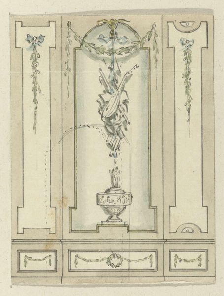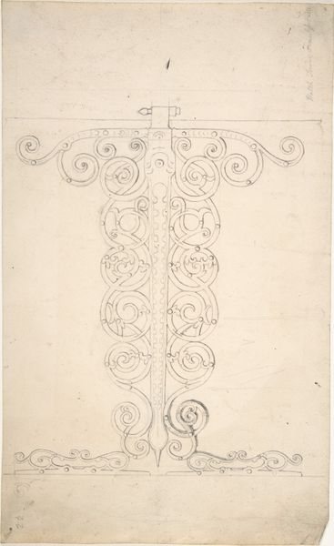 Here we have an anonymous design for the elevation of a table rendered in graphite, pen and watercolor. At first glance, the symmetrical composition is striking, a classical arrangement where a central stem rises to meet the table top above, stabilized by curved legs below. The artist balances the linear rigidity of the table’s frame with organic embellishments: leaves unfurl around the central support, while the table’s stem is stylized to resemble a fluted column. These contrasting elements create a visual tension, a dialogue between natural forms and constructed design. The selective use of watercolor highlights key structural points, drawing attention to the ornamental details and reinforcing the table's architectural qualities. What appears to be a straightforward design for furniture reveals a deeper engagement with classical motifs, questioning the boundaries between function and art, structure and decoration.